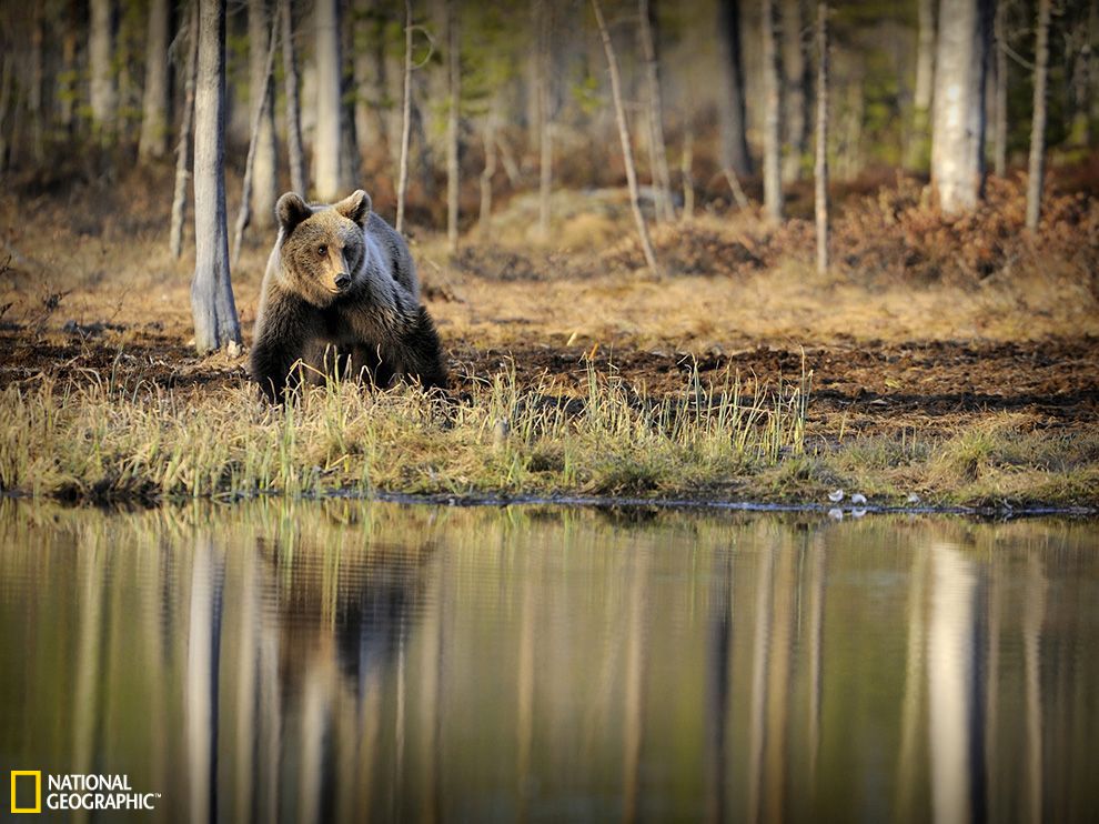 芬兰的一个无人地带,一头熊正在岸边徘徊。