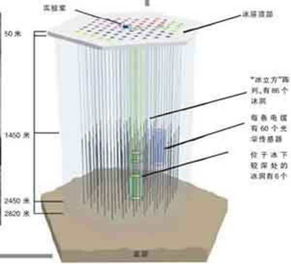 “冰立方”中微子“天文台”位于南极洲约2.4公里深的冰层下,经过长达10年的钻洞作业后于2010年建成,由全球40个学术机构参与建立。据报道,“冰立方”是一个容积为1立方公里的六方体,耗费超过2.7亿美元(约合人民币17亿元)。这个“天文台”的望远镜主要由深埋南极冰川底下的5160个光学传感器组成。“科学家们为5160个光学传感器钻了86个冰洞,每两个洞之间相隔800米,而每一条冻结在洞里面的电缆包含有60个光学传感器。”该项目工作人员亚当斯说。