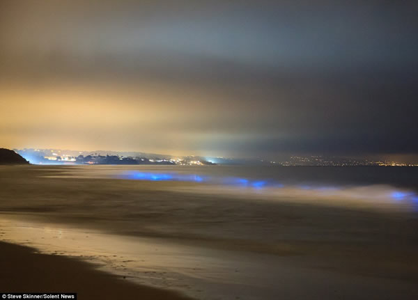 在午夜的时候四周都是黑暗的,但是这个著名的冲浪海滩上海浪的每一次碰撞都会产生怪异的蓝色闪光,这都被一位已经准备好用摄像机拍摄这种怪异现象的摄影师拍了下来。史蒂夫-斯金纳特意为了这种景色而来带这个海滩,这种景色是由水中的藻类导致的。当海浪碰撞的时候会导致藻类发出一种蓝色闪光,这种现象被称为生物性发光,就好像成千上万的生物体受到了打扰。
