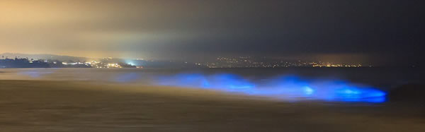当海浪碰撞的时候会导致藻类发出一种蓝色闪光,这种现象被称为生物性发光。