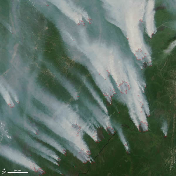 2012年7月10日,美国宇航局Aqua卫星上的中分辨率成像光谱仪(MODIS)拍下了这幅发生在雅库特境内的野火照片。阿尔丹河附近浓烟滚滚,并向北方飘去。红色线条标明因为火灾而导致地表温度极高的地点。