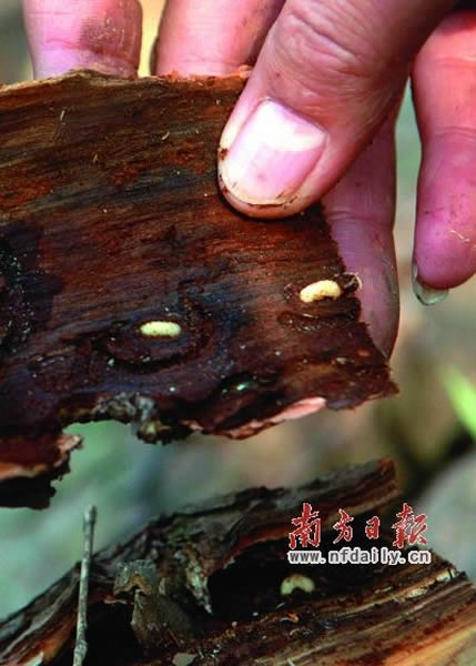 一棵受松材线虫病感染致死的松树内的松褐天牛白色幼虫。松褐天牛是松材线虫病主要的传播媒介。