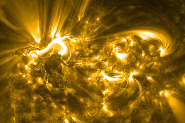 2012年7月12日,太阳南半球发生了耀斑爆发,紧随其后还发生了日冕物质抛射(CME),日冕物质以每秒1480公里的速度靠近地球。上面的这组照片是美国宇航局太阳动力学天文台(SDO)的大气成像仪拍下的,其中第二幅为特写照片。照片中的黄色和青色皆为伪色,用以区分光谱带。
