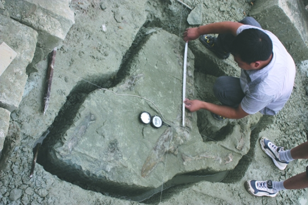 自贡发现肉食性恐龙化石 来源: 神秘的地球 时间:2012年7月18日 11:27 自贡发现肉食性恐龙化石 自贡市自流井区舒坪镇一采石厂日前发现了部分恐龙化石,经初步鉴定,此次发掘的恐龙化石为肉食性恐龙化石。(图中圈内为恐龙头部)这是自贡市继1985年首次发现亚洲最大肉食性恐龙和平永川龙之后的再次发现。目前这批包括部分脊柱在内的8块化石已发掘完毕,保存于自贡恐龙博物馆,等待进一步研究。 四川新闻网-成都商报 周茂梅 上一篇 下一篇 TAG: 化石 恐龙