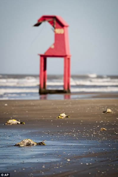 这些企鹅尸体被海水冲到位于城镇特拉曼达伊和西德雷拉之间的海滩上,这里距南里奥格兰德州首府阿雷格里港约60英里。
