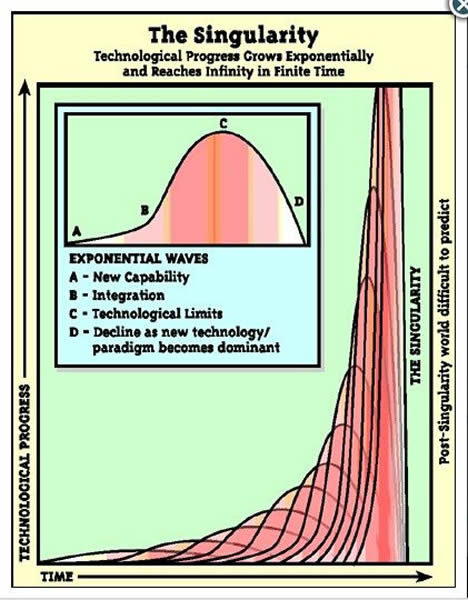 科兹威尔的这些预言听上去像是天方夜谭一般,甚至让人觉得有些荒谬。但事实上,这些预言都是基于这样一个事实,那就是技术进步的速度是以几何级数加快的。他说:“计算机技术以及我们对于自身身体的内在程序——基因的了解,所有这些都在以惊人的速度向前发展。”根据他的“技术加速”理论,在接下来的1/4个世纪内,我们人类的技术水平还将发生“数十亿倍”的进步。他说:“在现实中,技术水平上升一倍所需要的时间正在不断缩短。这是一条指数级的增长曲线,当抵达一定的临界点之后,技术水平的上升速度开始呈现井喷式的加速:原本需要20年才能达成的技术进步现在只需要10年,5年,然后是2.5年,0.75年,如此不断加速。”科兹威尔认为我们目前正处于这一临界点附近,即将迎来一轮急剧的技术进步加速阶段。
