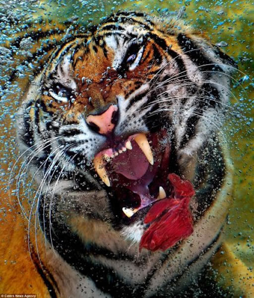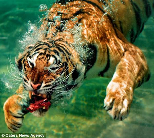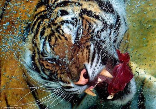 照片中,一只饥饿的猛虎快速跃进水中,摆出凌厉的姿势,露出像剃刀一样锋利的牙齿,瞪大双眼找寻美食,张开血盆大口扑向训练员扔进水中的一块生肉,最终将美食收入口中。