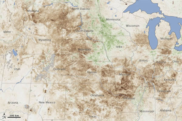 这幅美国农作物受灾地图是根美国宇航局的Terra卫星上的中分辨率成像光谱仪(MODIS)的观测数据绘制
