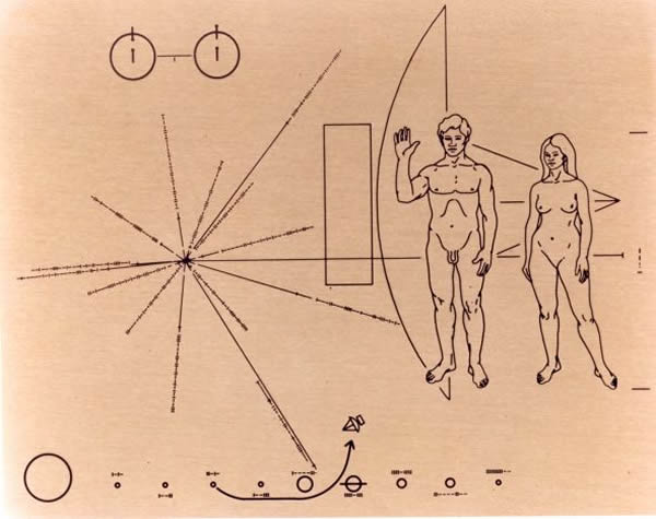 根据著名天文学家卡尔·萨根的建议,先驱者10号和11号上都携带了由萨根亲自设计的一个小小金属铭牌,上面标明了它们出发的时间和地点,这是考虑到当它们飞出太阳系,在茫茫宇宙中飞行时,有朝一日可能遭遇其他外星文明的飞船。根据它们设定的航向,先驱者10号飞船正向着金牛座毕宿五飞行,如果一切顺利,它将在大约200万年后抵达那里