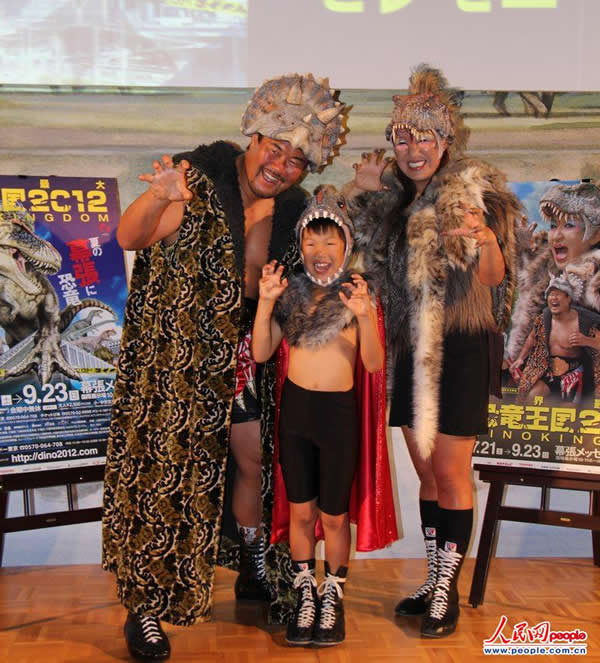 日本职业摔跤选手佐佐木健介一家作为“世界最大恐龙王国2012”大型展览的支持者身着“恐龙装”前来助阵。