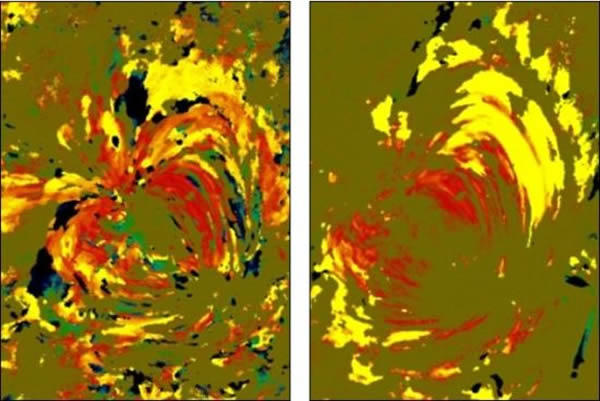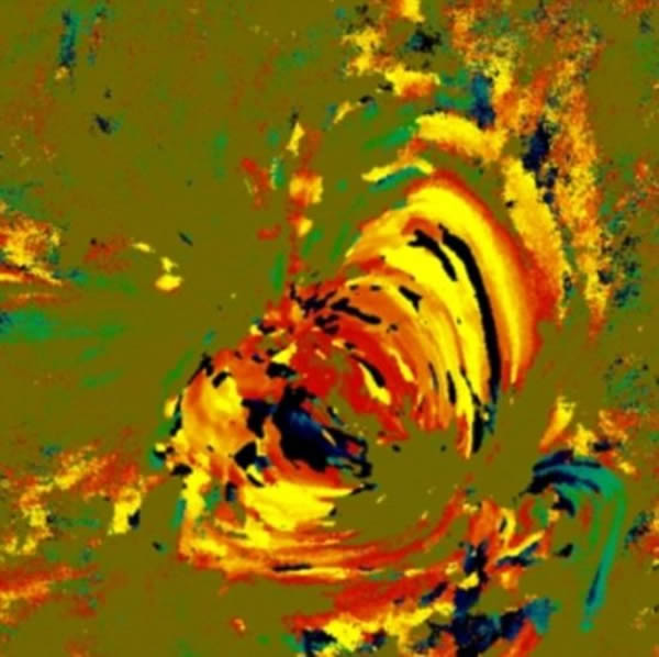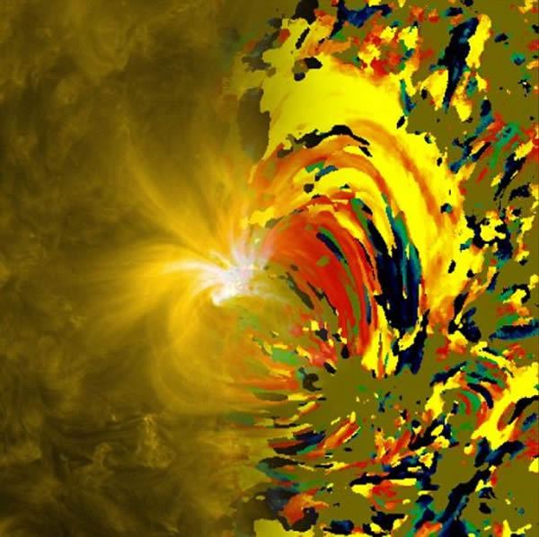乍看一下这就像是后印象派画家梵高的作品,但事实上,这是美国宇航局绘制的太阳表面的热变化图。这种可视化技术是美国宇航局用于处理海量数据的一种技术手段,比如在这里所展示的就是一段在24小时内太阳表面发生的温度升降变化。这张图像中的每一个像素都代表了很多反映温度变化的信息,可以提供反映驱动太阳高温的外层大气——日冕层的温度和运动情况的机制。