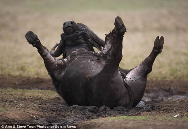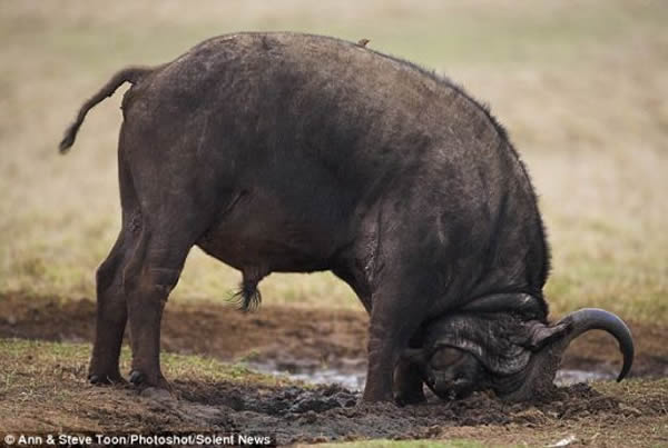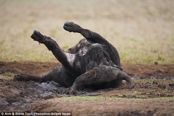 英国摄影师史蒂夫-图恩和安妮夫妇参观南非东开普地区阿多大象国家公园时拍到这个动物的有趣瞬间。安妮今年53岁,住在英格兰诺森伯兰国家公园,她说:“这头水牛在阿多大象国家公园的一个小池塘中尽情享受着泥浴。它花了相当长一段时间在水边打滚。它一头倒进清凉的泥浆中翻滚,以确保泥浆盖满全身。这个过程就像人为面部美容所做的泥敷膏一样。泥巴干了后,就会带着恼人的寄生虫或扁虱脱落,这有点像帮助水牛保持健康的调理治疗。”