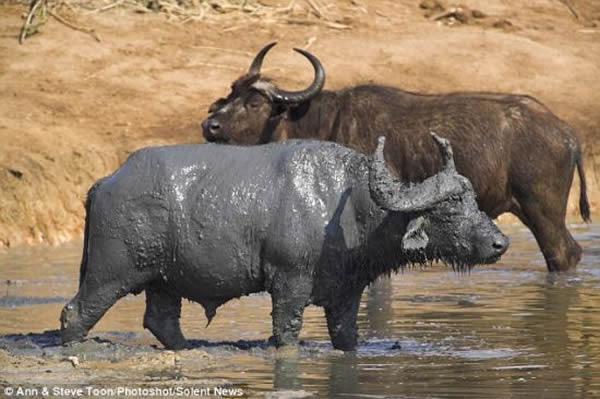 49岁的史蒂夫表示:“看到一个非常滑稽的画面,你会忍不住拿出相机把它拍下来。看起来这头水牛好像对打滚和用泥浆把自己弄脏情有独钟。”非洲水牛是非洲五霸成员之一,被看成是所有物种中最危险的动物。