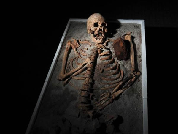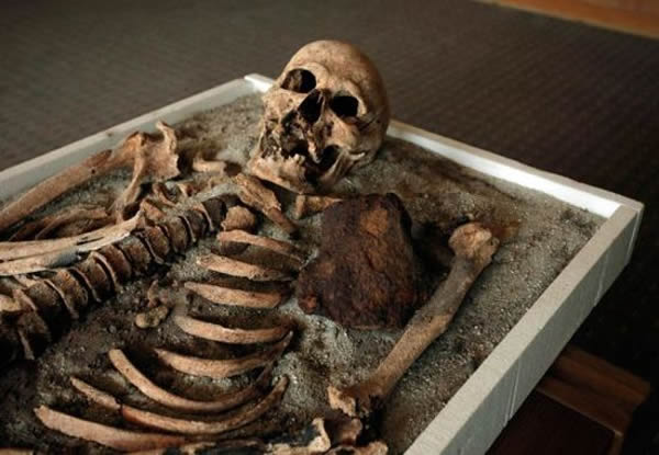 这具被认为可能成为“吸血鬼”的遗骸被埋葬于黑海之滨小镇索佐波尔一处教堂废墟下。考古学家发现,一根铁棒从遗骸胸部穿过(右上部),将其钉于墓中。此外,从遗骸上可以看出,其牙齿全部被拔光。研究人员认为,这根铁棒和拔牙现象说明,这些都是当时村民用来防止死人变成吸血鬼的技术。在欧洲许多国家,对于吸血鬼的恐惧可以追溯到上千年前。国家地理原历史学家马克-克林斯-简金斯在《吸血鬼取证》一书中写道,“在数千年前的墓地中,遗骸通常会被发现呈现被钉住、被绑住、被面朝下埋葬或被斩首的情形,所有这些方式都是生者用来防止行尸的攻击。”