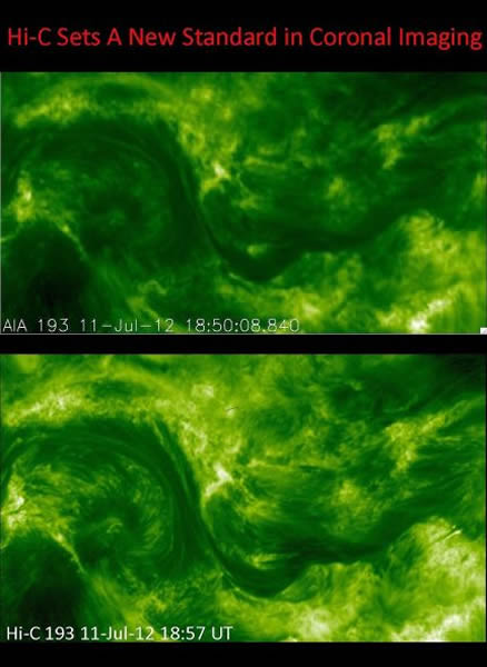 高分辨率日冕成像仪是一台太空望远镜,采用新型反射镜,能够捕捉宽度小到135英里(约合217公里)的太阳结构影像。高分辨率日冕成像仪和太阳动力学观测卫星之间的差距相当于普通的阴极射线管电视与高清电视之间的差距。