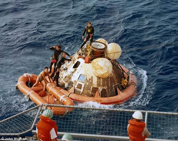 此次营救任务并不轻松,他们需要稳定返回舱并确保安全,而后对宇航员进行消毒,最后由一架盘旋在上方的直升机吊着他们飞往“大黄蜂”号航空母舰。作家斯科特-卡米查尔表示,在登上返回舱前,他首先要套住返回舱。从在溅落地点上方低空盘旋的直升机上,沃尔弗拉姆纵身跳进冰冷的海水,利用套索套住返回舱。沃尔弗拉姆为返回舱装上一个水下降落伞(被称之为海锚),防止1.2万磅(约合5443公斤)重的返回舱移动和旋转。这是一项超人般的壮举。“如果换成普通人,一定无法完成这项任务。”卡米查尔曾创作一部讲述此项任务的著作,名为“重返地球”(Moon Men Return)。