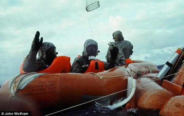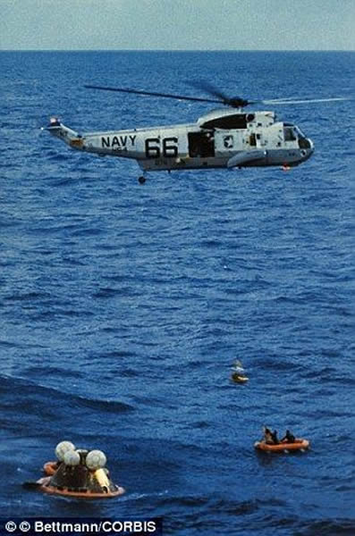 宇航员被放入篮子状的网里,而后在海军直升机的帮助下,前往“大黄蜂”号航母
