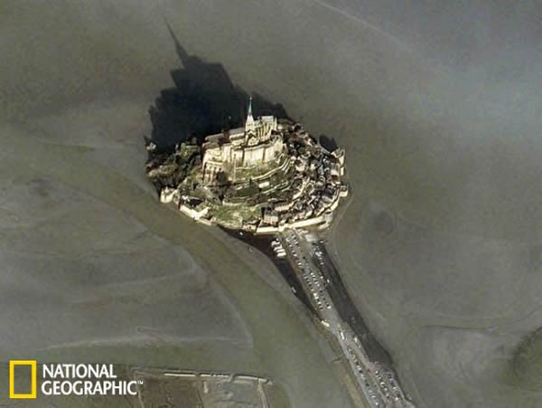 这是法国圣米歇尔山(Mont-Saint-Michel)的俯瞰照片,由昴星团卫星从太空中拍摄,时间是5月3日。直到19世纪末,这个小岛屿和大陆之间都没有桥梁相连接,因此这里只有在低潮位时人们才能上去。