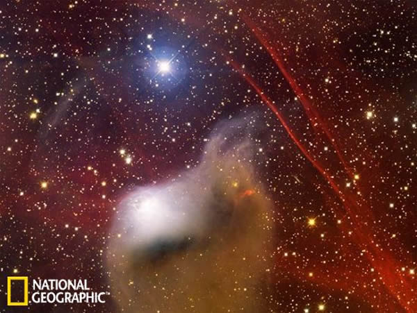 这是VdB 152星云,距离地球约1400光年,这是宇宙中尘埃和气体云构成的天体,它在一个博克球状体的一端闪耀着。所谓博克球状体是一种暗黑的低温球状星云,它内部厚厚的尘埃气体层让它看上去几乎是不透明的。而图像右侧那些纤细的红色条纹则是古代超新星爆发的遗迹,暂时无法判断它们是否会在将来某一时刻与这个星云发生相互碰撞。