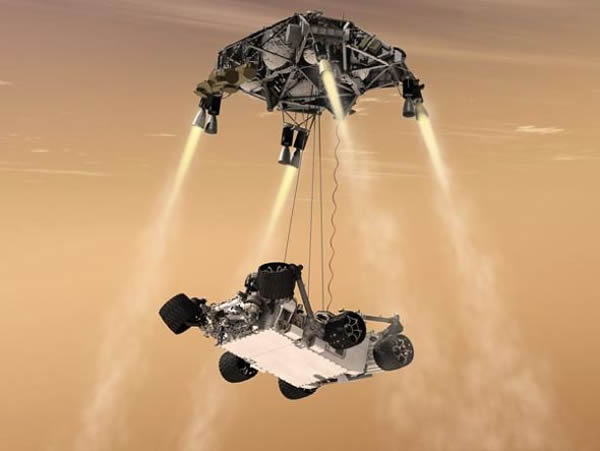 “好奇”号火星车又称“火星科学实验室”号,耗资25亿美元建造,着陆后将对盖尔陨坑进行勘测,确定这一地区是否能够支持微生物存在。由于体积较大,工程师不得不设计一种新的着陆方式。他们为“好奇”号安装了火箭动力太空起重机,利用绳索将这辆火星车降落到火星表面。