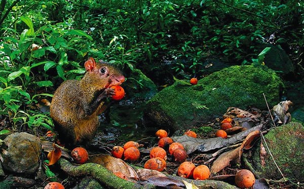 在储藏黑棕榈树种子之前,刺鼠会将果肉剥掉,以防被其他动物发现。