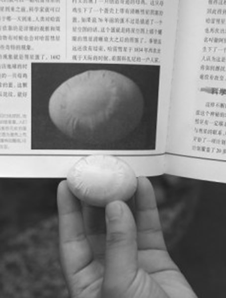 王女士拿出“怪蛋”,记者上前仔细看,发现与其他鸡蛋大小无异,只是在蛋壳中间嵌有一个颜色较深的圆圈,周围布满了太阳光芒状的纹路,模样十分清晰,似一幅立体浮雕。“我家在屋后养了几只鸡,刚拣到这个鸡蛋的时候,我没发现和其他的鸡蛋有什么不一样,只是觉得它的蛋壳有点褶皱,以为没长好,也就没在意。”王女士向记者回忆道,“再仔细一看,发现蛋壳上的纹路很奇特。”之后,王女士在一本《奇趣自然未解之谜》书中看到一篇《奇特的哈雷彗星蛋》,惊奇地发现书中的鸡蛋和自己家的“怪蛋”几乎一样。