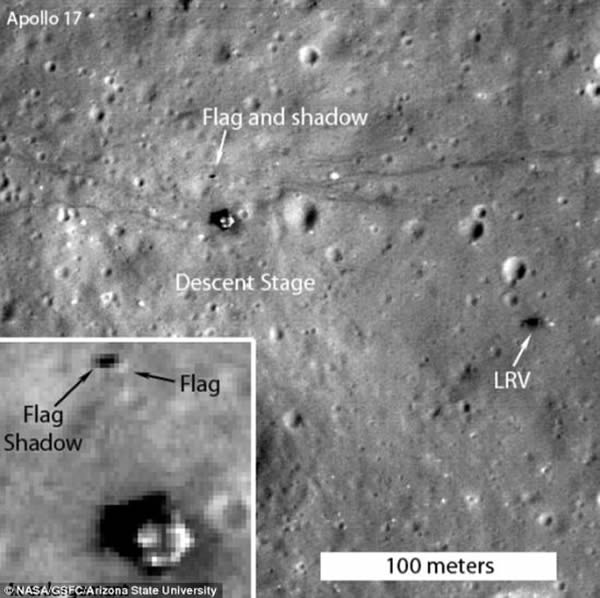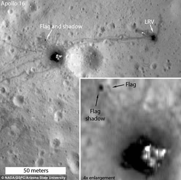 借助于月球勘测轨道照相机拍摄的照片,科学家对国旗随着月球旋转在其周围投下的影子进行分析,最后证实国旗仍矗立在月表上。月球勘测轨道项目研究员马克-罗宾逊表示:“根据月球勘测轨道照相机拍摄的照片,除了‘阿波罗11’号外的所有美国国旗仍然屹立不倒。在‘阿波罗11’号起飞离开月表时,宇航员巴兹-奥尔德林报告称国旗被发动机的排气吹倒,现在看来,奥尔德林说的是真的。”