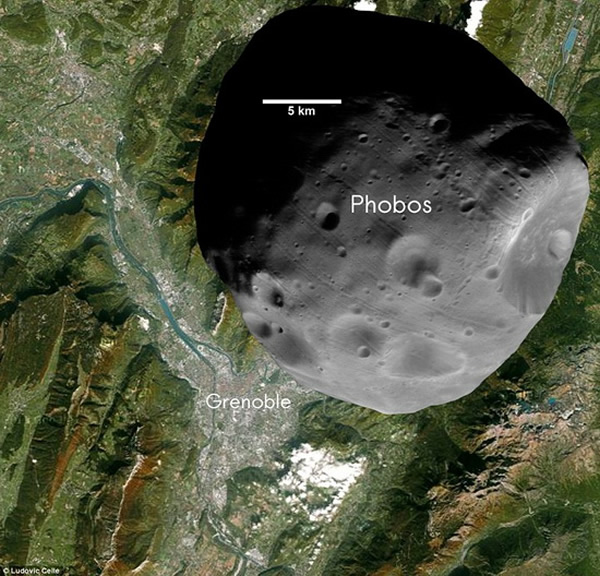 这种创新式计算机图像效果,呈现了火星及其卫星的比例大小,是由平面设计师鲁多维西-塞勒(Ludovic Celle)制作的,他使用计算机图像处理技术重建了这颗遥远的卫星,向人们清晰地显示火卫一与法国格勒诺布尔市之间的比例大小。