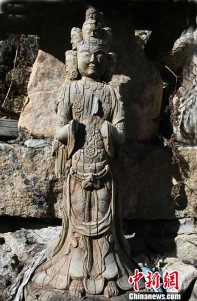 该寺院内有一件高约70厘米的木雕十一面观音像文物,“这尊木雕文物系汉地制作的盛唐时代作品,大约在公元8世纪。木雕十一面观音像早于寺庙建院300年。”中国著名佛教考古专家温玉成教授说,国内最早的十一面观音雕像在龙门石窟,是武则天时期雕造的。这尊十一面观音造像的发现反映了藏汉民族8世纪就有佛教文化的交流。