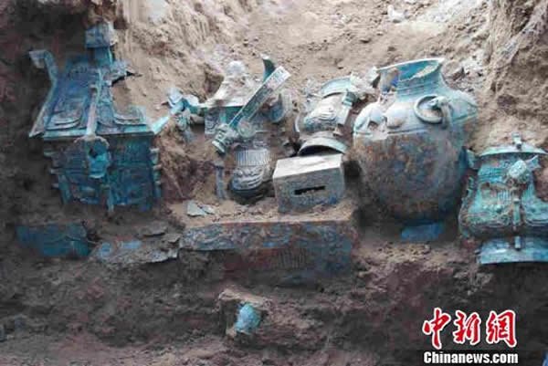 他说,目前这批青铜礼器铭文可分辨的不少于30个字,最多的为9个字,在一座铜尊上所刻;最少1个字,是一个青铜甗上刻的族徽。从随葬的礼器上分析,这些青铜器不是周人的,而是商朝时期所铸,属于商人所有。来源有两种可能,一是发生战争时的战利品,二是家族之间的交换品。相比之下,前者的可能性较大。