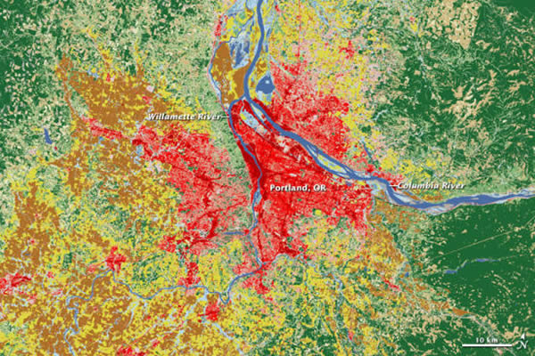 美国宇航局地球观测站今日公布了一张卫星测绘地图,展示了美国俄勒冈州波特兰市的土地用地及城市扩张景象。