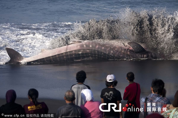 当地时间2012年8月2日,印尼班图尔,一头鲸鲨在海滩搁浅,由于救援人员没能及时将其拖回海中,这头鲸鲨在海滩上死亡。据当地NGO成员说,这头鲸鲨是在觅食时被冲上岸的。鲸鲨是须鲨目的一种,是目前世界上最大的鱼类。鲸鲨为鲸鲨科及鲸鲨属中唯一的成员,以浮游生物、巨大的藻类、磷虾与小型的自游动物(例如小型乌贼与脊椎动物)为食,对人类无害。
