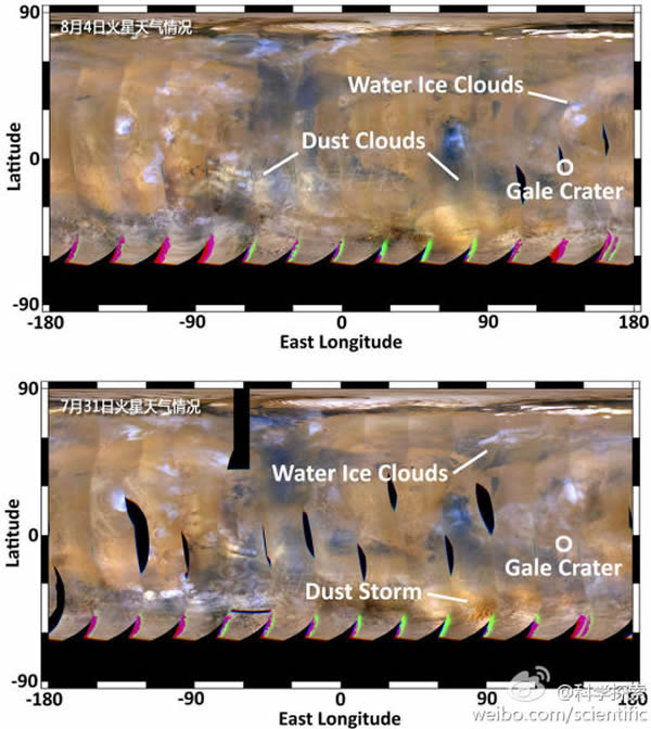 据美国宇航局网站报道,这张火星全球图于2012年8月4日由美国宇航局的火星勘测轨道飞行器上的火星彩色成像仪获得。这个仪器每天拍一张火星全球图,为美国宇航局的好奇号进入火星大气并下降、着陆的整个过程预报天气条件。盖尔撞击坑周围的大气是晴朗的季节性的,与用来模拟好奇号着陆的计算机模型是一致的。7月31日首次在这个撞击坑西南发现的沙尘暴已于8月2日变成一个不太活跃的尘埃云,现在已经更加分散。在火星的另一侧发现了沙尘活动,也就是在这张地图的左侧标注的尘埃云。在好奇号着陆之前,这些尘埃云都不会到达盖尔撞击坑。
