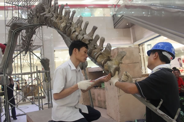 工作人员正在安装恐龙化石