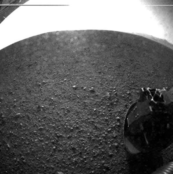 加利福尼亚州帕萨迪纳市,在美国宇航局(NASA)喷气推进实验室(JPL)的一间控制室内,当火星科学实验室的成员看到“好奇”号火星车在这颗红色星球安全着陆几分钟后发回的第一张图像出现在大屏幕上时,人们兴奋地欢呼着、热烈地拥抱着,许多人甚至喜极而泣。“好奇”号着陆团队负责人AllenChen感叹道:“这真是难以置信!”而这张图像注定会加载一个具有历史意义的注释:美国太平洋夏令时2012年8月5日22点32分,“好奇”号火星车摄于火星表面。