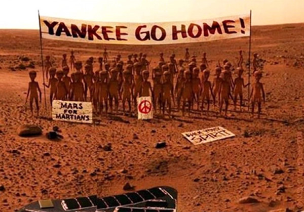 网友PS出的“好奇”号遭遇火星人场景,火星人高举标语,要求“美国佬滚回地球”