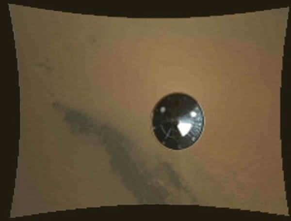 火星降落成像系统仪器火星降落成像仪(MARDI)拍摄到的“好奇”号,它展示的是距离飞船大约50英尺(16米)的直径15英尺(4.5米)的隔热板