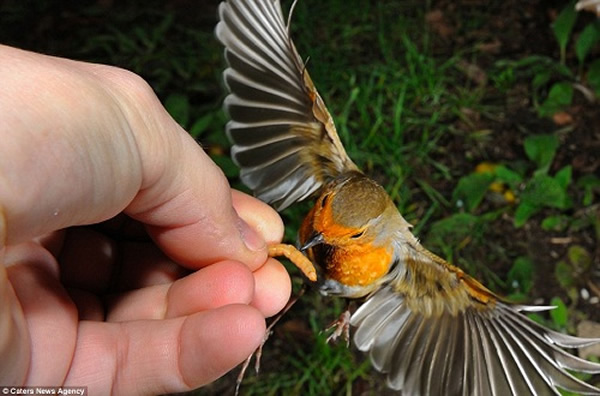 据报道,知更鸟是英国最常见的一种鸟类,通常在夜间鸣叫,声音悦耳动听,很受人们喜爱。但知更鸟的领地意识和防御性都很强,这只敢从人类手中取食的鸟的大胆行为在知更鸟中非常少见。