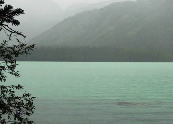 “喀纳斯”为蒙语,意为“峡谷中的湖”。喀纳斯湖湖面海拔1374米,湖水最深196米,面积45.73平方公里。图片是在7月29日下午16点45分拍摄的。当时,湖北游客龚海燕一行七人在新疆喀纳斯湖一道弯游冒雨游玩。