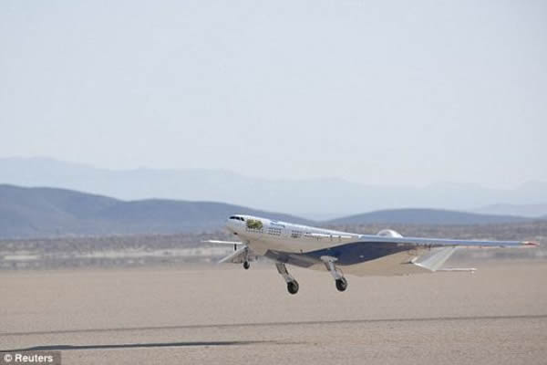 美国加利福尼亚州爱德华兹空军基地,远程遥控的X-48C翼身融合飞机从罗杰斯干湖起飞,进行第一次试飞
