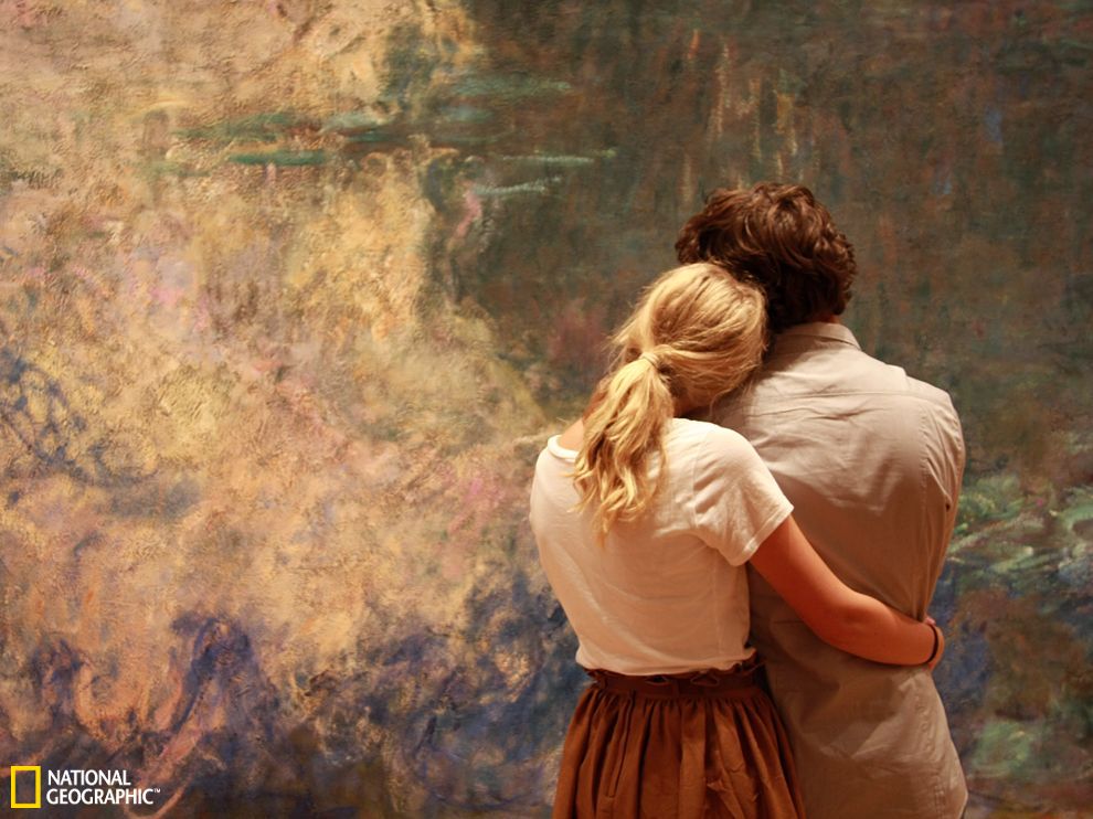 美国纽约现代艺术博物馆,一对夫妇正在欣赏莫奈的《睡莲》。