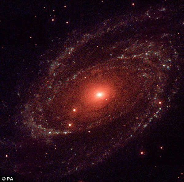 一个螺旋星系环绕在一个超大质量黑洞周围,较大质量的发光气体和灰尘被黑洞抽吸