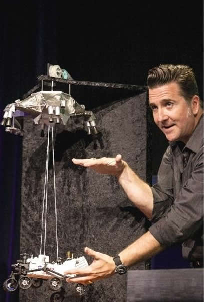 当地时间2012年8月2日,施特尔茨纳在新闻发布会上利用模型讲解着陆火星时的关键步骤。
