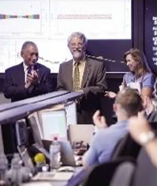 白宫科技顾问Holdren(左二)来到火星科学实验室祝贺好奇号成功着陆。