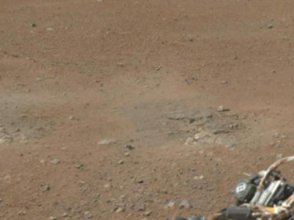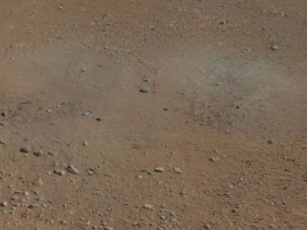 这张图是从好奇号桅杆相机拍摄的全景照片左侧部分截取下来的,图中显示了好奇号的火箭引擎喷射后地面的景象。
