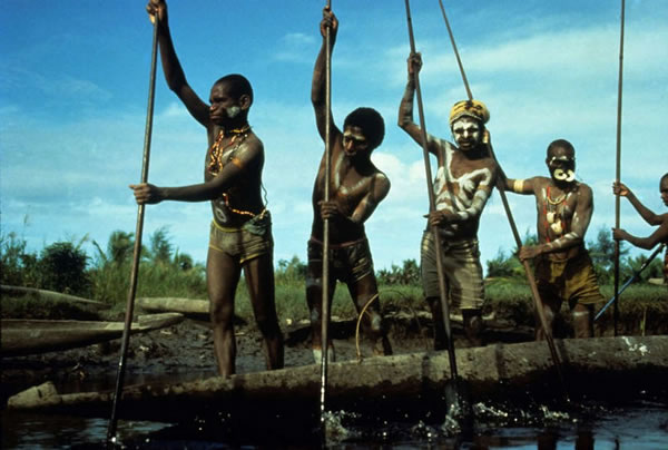 在巴布亚南部,赤道以南的低纬度地区,生活着半游牧的阿斯马特人,然而至今,这些他们居住的海岸地带还没有公路。所以,阿斯马特人只能长期使用独木舟在热带雨林下广阔而深邃的河流网络中川行。他们可以站立着划桨推动独木舟前行,他们还可以在涨潮的水中清洗桨叶,并且仍保持着身体平衡;甚至一个特别困难和危险的任务——他们可以通过逆流而湍急的河水进入阿拉弗拉海。自1963年起,所有的阿斯马特部落地区都被印度尼西亚占领,部落的人们遭遇了空前的暴力与杀戮。照片由Jeanne Herbert摄。