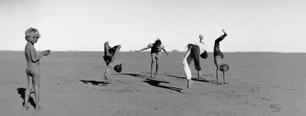 在炙热的澳大利亚中部沙漠,pitjantjatjara的原住民儿童炫耀着他们的空翻和转体技能。照片由Alastair McNaughton提供。