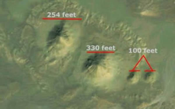 米克尔说:“通过对该结构进行更加仔细的研究发现,这个土堆的顶部显然非常平坦,而且形状呈对称的三角形,不过它已在时光的流逝中,遭到严重侵蚀。”第二处位于向北90英里(144.84公里)处,长140英尺(42.67米),呈方形。米克尔说:“它拥有截然不同的方尖顶,对这种大小的土丘来说,这很不同寻常,从高处看几乎就能确定它是一座金字塔。”她表示,那里还有三个小土丘,“它们的分布与吉萨金字塔的对角线排列方式类似。”