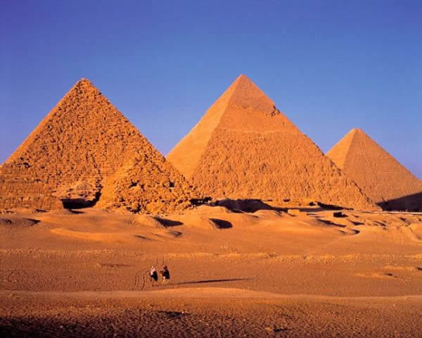 吉萨大金字塔(中)是目前已知最大的金字塔,也是世界七大奇迹之一