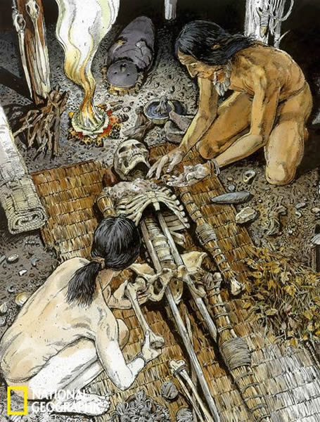一个戴假发的史前男子尸体被放置在芦苇编织物中,这个木乃伊带有明显的新克罗人复杂的木乃伊工艺痕迹。新克罗人并不是尽量保存肉体,而是用被锰浸泡过的沙土来雕刻这些被剥离了肉体的骨骼,而且内部的器官也被泥土所替代掉了。马克特和他的研究团队认为新克罗人的木乃伊工艺是在大约7000年前安第斯山脉的长期雨季中意外产生的。马克特介绍说,“大量降雨让低地处充满了水源,这也让周围的环境充满了各种其他的物质,包括更多的鱼群、贝壳和更多其他可以狩猎的动物。这让新克罗人的人口大大增加,人口的增加也反过来促使了木乃伊工艺的发生。”